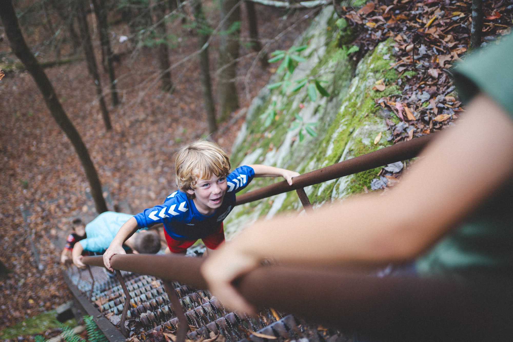 This hike is unreal! This trail features rope ladders, wooden ladders, gigantic sandstone walls, a scenic overlook, a trail that traverses up a river, and boulders you crawl over and through. It’s spectacular and challenging. This is a memorable trail that exemplifies what makes the Cumberland Plateau region such a worthy complement to the Great Smoky Mountains National Park. Younger children may be able to hike the first half (traveling counterclockwise from the trailhead); you can walk the road back to the trailhead. The second half of the trail contains more challenging (but very beautiful) sections. Still, it’s hard – probably the most difficult for most in this book, making it best for the older kiddo hiker. Oh, and you will definitely want to be prepared to get your feet wet on this hike!